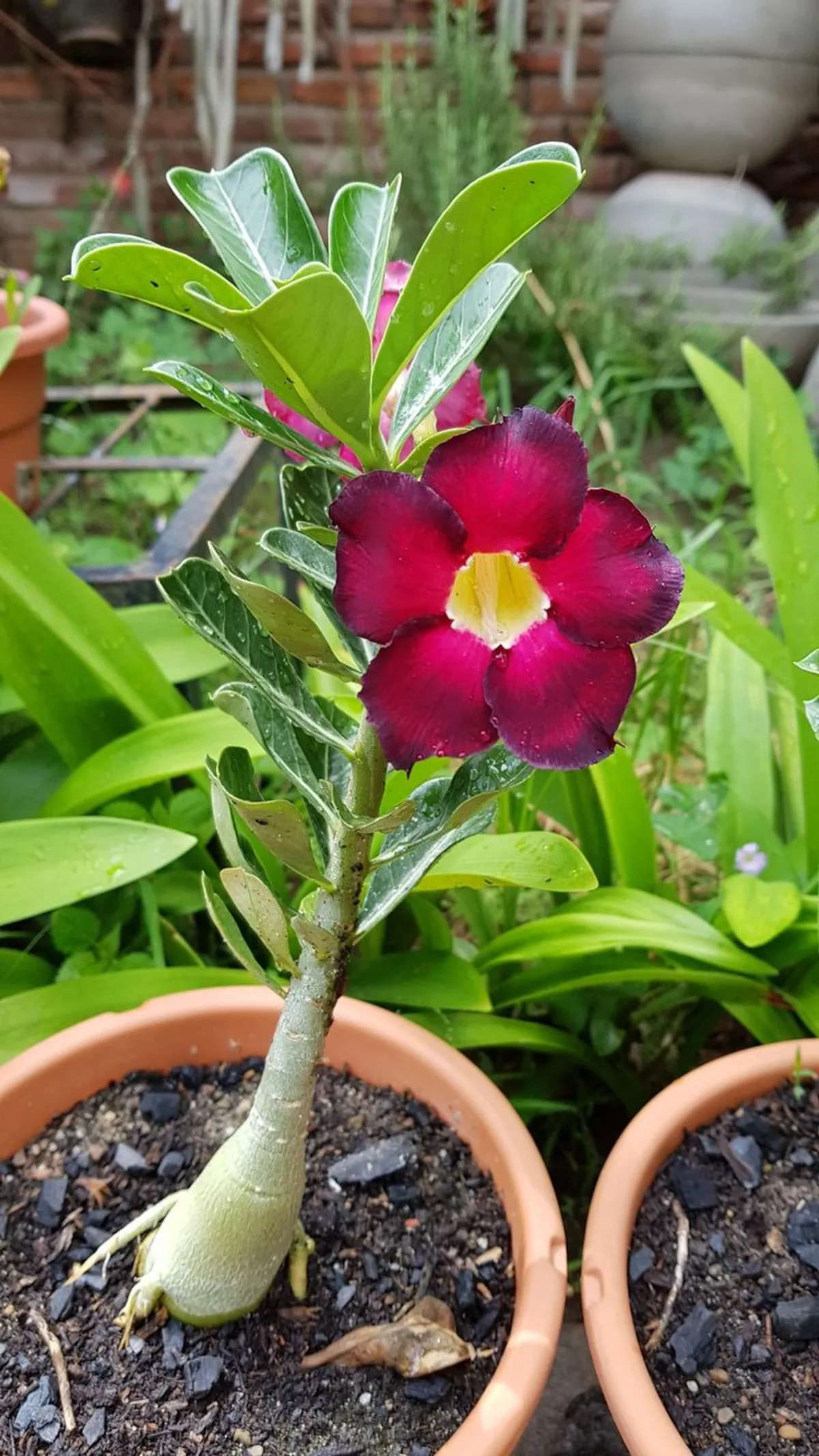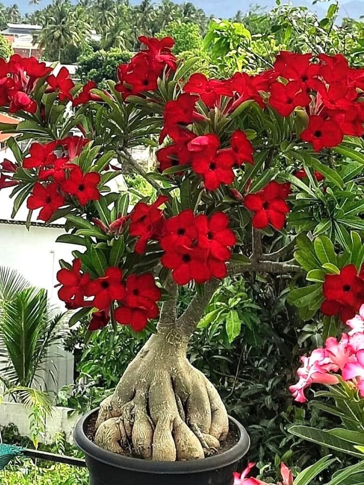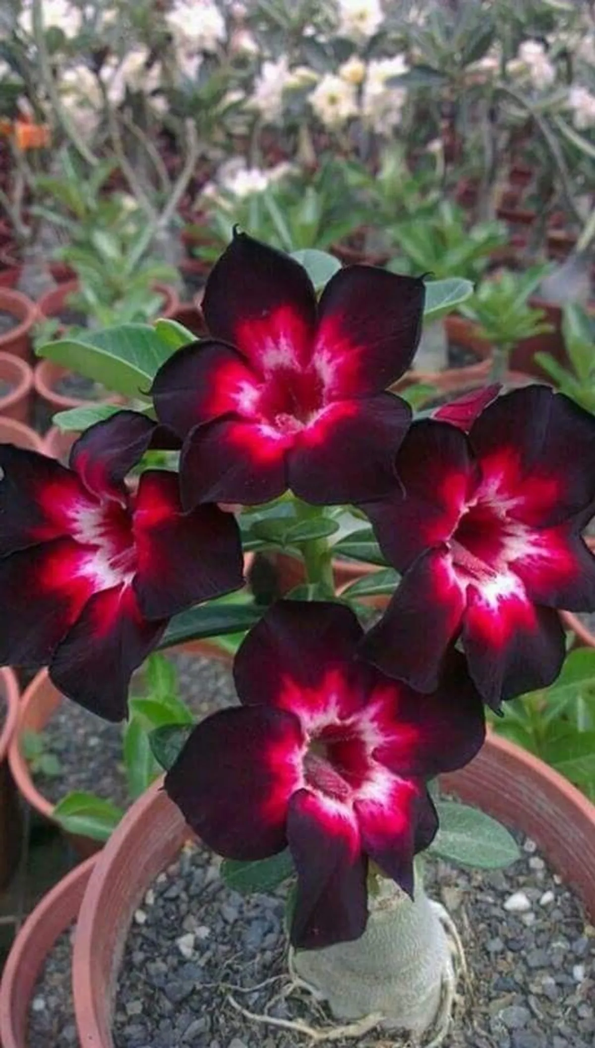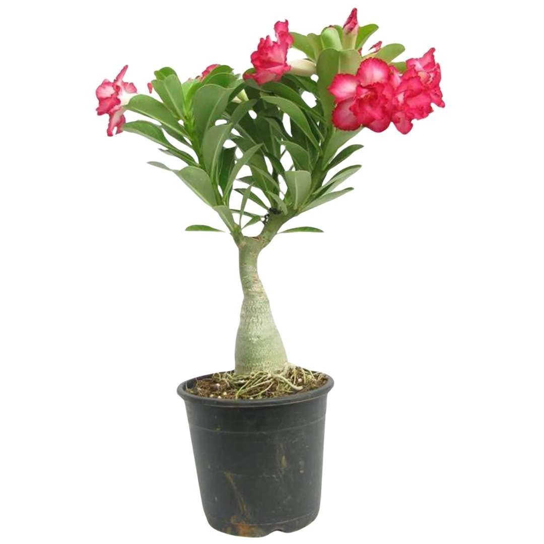 The Adenium, commonly known as the Desert Rose, is a striking ornamental plant admired for its thick, sculptural stem and vibrant trumpet-shaped flowers. Native to arid regions, the Adenium thrives in warm climates, making it a perfect choice for both indoor and outdoor spaces. Its unique, bonsai-like appearance, coupled with its vibrant blooms in shades of pink, red, and white, makes it a favorite among garden enthusiasts. Easy to care for and drought-tolerant, the Adenium brings a touch of the exotic to any space.